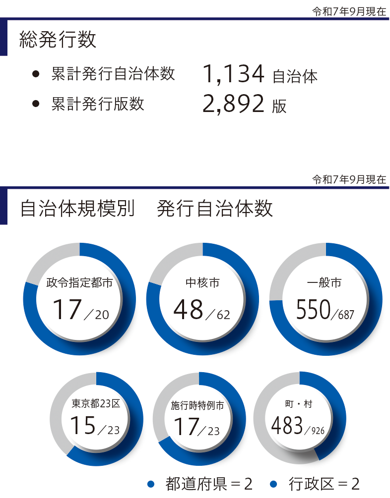 わが街事典は平成19年(2007年)の事業開始以来、1,134の自治体との協働発行を実施。 全国の基礎自治体の中で、市と東京都特別区におきましては、すでに80%のシェアでわが街事典を発行、町村では協働事業が可能な自治体を中心に、現在50%まで拡大しております。 また、掲載情報を更新した改訂版を2年から3年のサイクルで発行しています。 これにより総発行版数は2,892版となり、累計発行部数は1億4,261万部に到達いたしました。