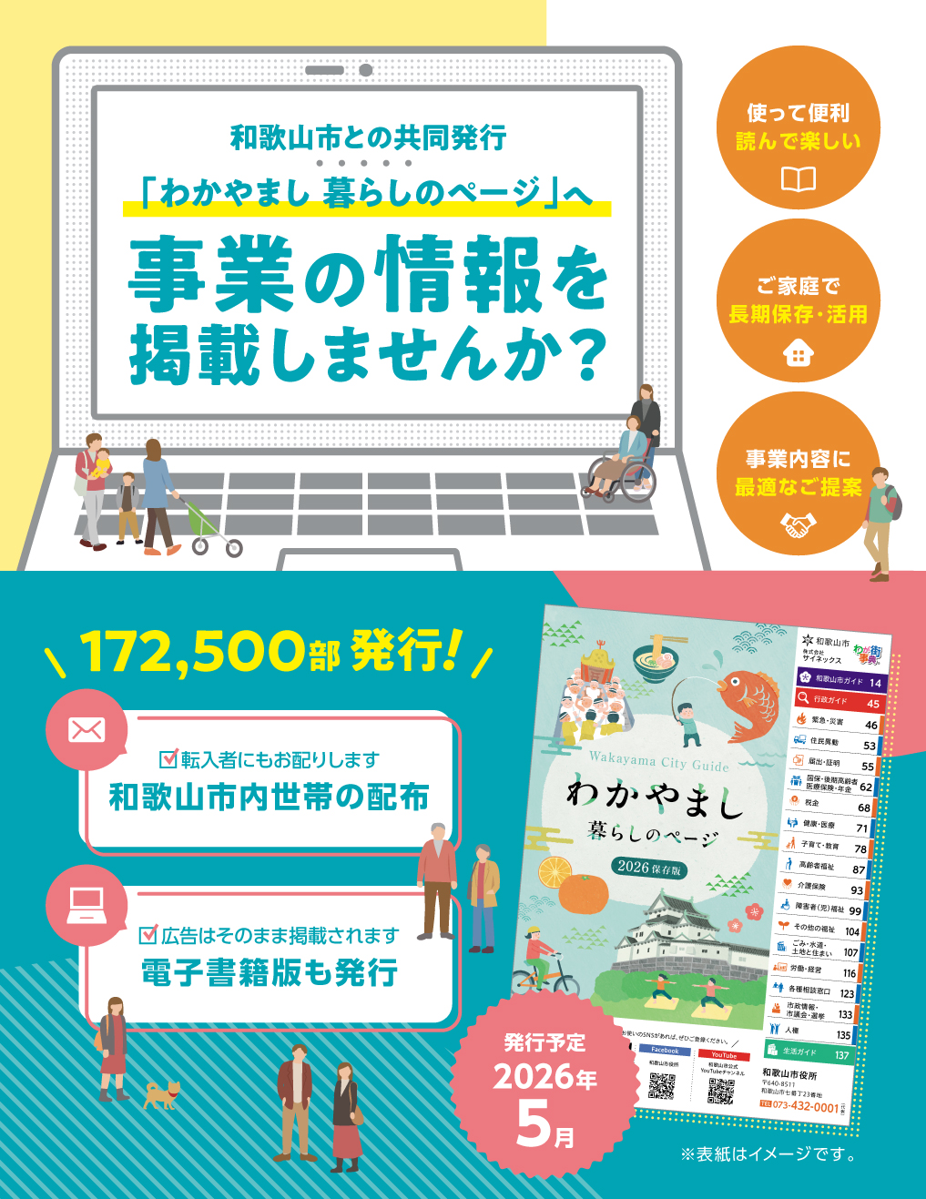 和歌山市では、令和8年5月を目途に市役所の窓口や各種手続等の行政情報に加え、歴史・観光などの地域情報を掲載した冊子「わかやまし暮らしのページ」を株式会社サイネックスと協働発行の上、全面改訂し、市内全世帯に配布することになりました。