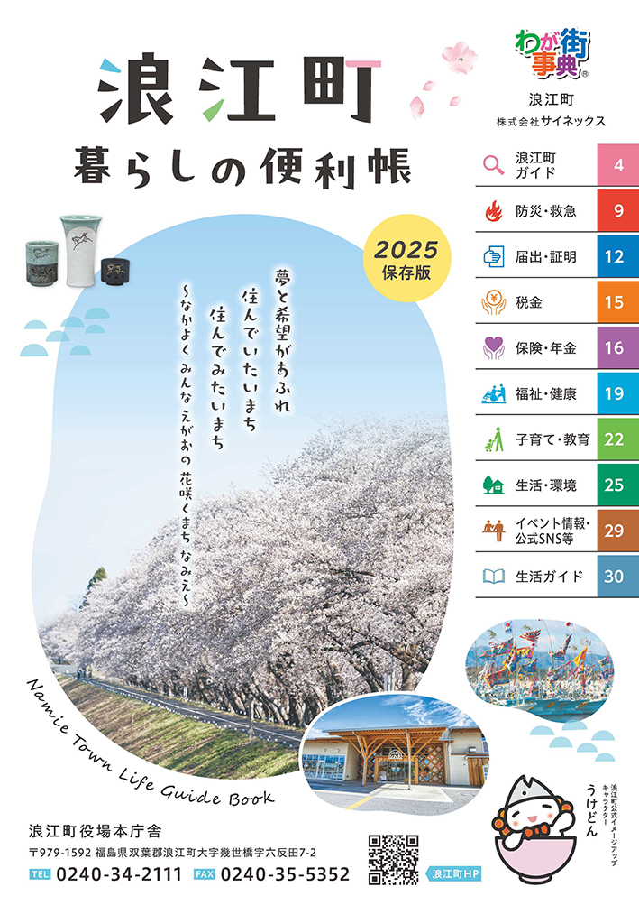 福島県浪江町(吉田 栄光 町長)と株式会社サイネックスは、官民協働事業として『浪江町 暮らしの便利帳』を共同発行いたしました。