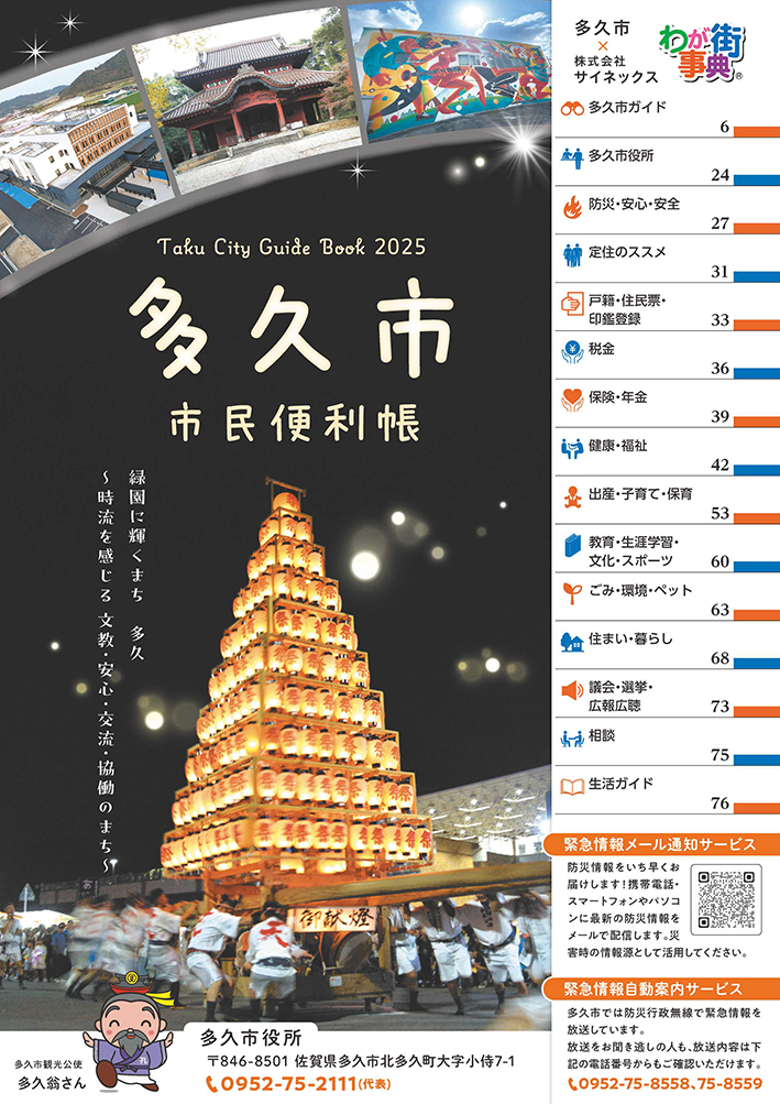 この冊子は、西溪公園などの多久市の自然・景観をはじめ、領民に学問を奨励し、文教の地・多久を築いた多久茂文が創建した東原庠舎や多久聖廟などをガイドし、春と秋の聖廟釈祭や多久山笠などのイベントカレンダー、女山大根や岸川まんじゅうなどの特産品を紹介するほか、多久市の学校教育や公立佐賀中央病院、乗合送迎サービス「チョイソコたく」などの行政情報を掲載した地域行政情報誌として発行いたします。