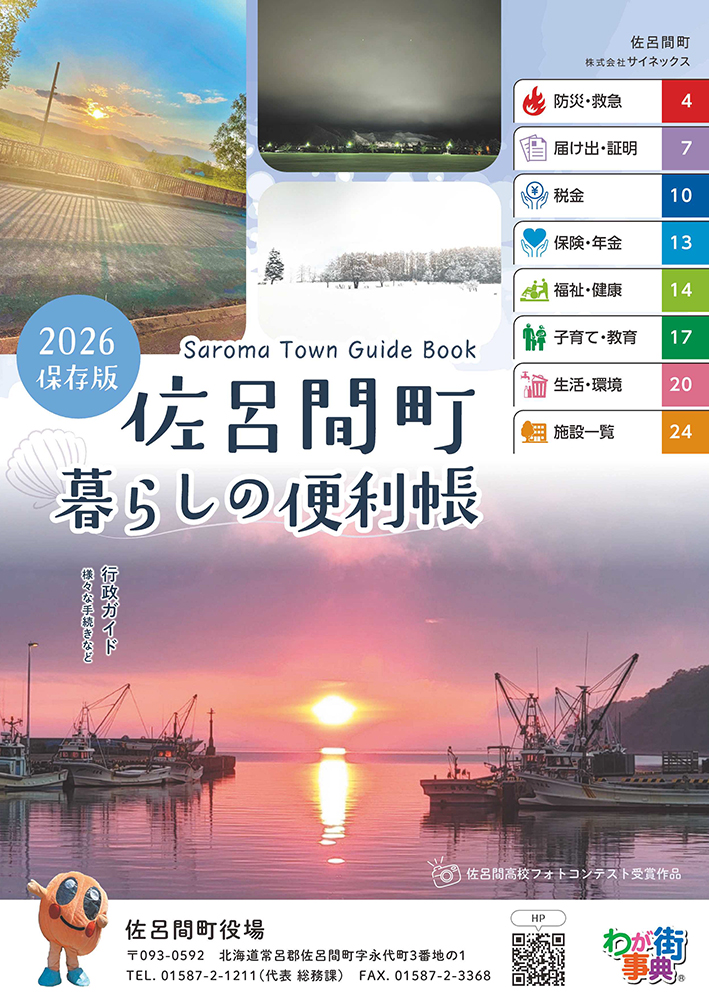 この冊子は、表紙に佐呂間高校フォトコンテスト受賞作品を紹介し、佐呂間町の防災・救急などの行政情報を掲載した地域行政情報誌として発行いたします。