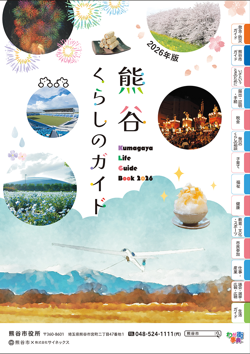 この冊子は、熊谷市の救急・防災ガイドや熊谷スマートシティの取組み、子育て支援などの行政情報をはじめ、「西の花園、東の熊谷」と言われるラグビータウン熊谷や、妻沼滑空場で開催される全日本学生グライダー競技大会のなど「スポーツ熱中都市 熊谷」をガイドするほか、妻沼聖天山などの文化・史跡やかき氷の「雪くま」、銘菓「五家宝」などの地元フード、熊谷さくら祭や熊谷うちわ祭など四季のイベントを紹介した地域行政情報誌として発行いたします。