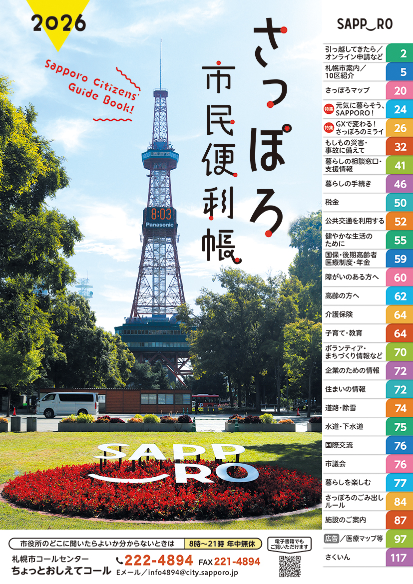 札幌市への転入者向けに発行されたこの冊子は、巻頭に「引っ越してきたら」やオンライン申請などの市政情報をはじめ、「お出かけ案内」で円山動物園やさっぽろテレビ塔展望台、モエレ沼公園などの観光スポット等を紹介。時計台などの歴史や札幌市民交流プラザなどの文化・芸術、さっぽろラーメンやシメパフェなどのさっぽろグルメ等を掲載するほか、市内10区紹介や「元気に暮らそう、SAPPORO!」「GXで変わる!さっぽろのミライ」を特集した地域行政情報誌として発行いたします。